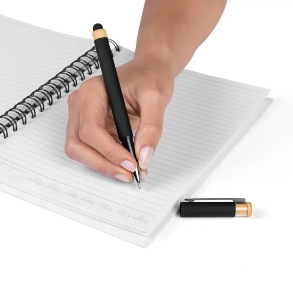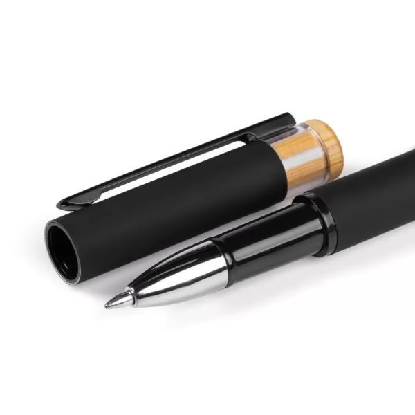 Caneta preta em Alumínio reciclado / Bambu com tampa. Conta com carga roller azul.